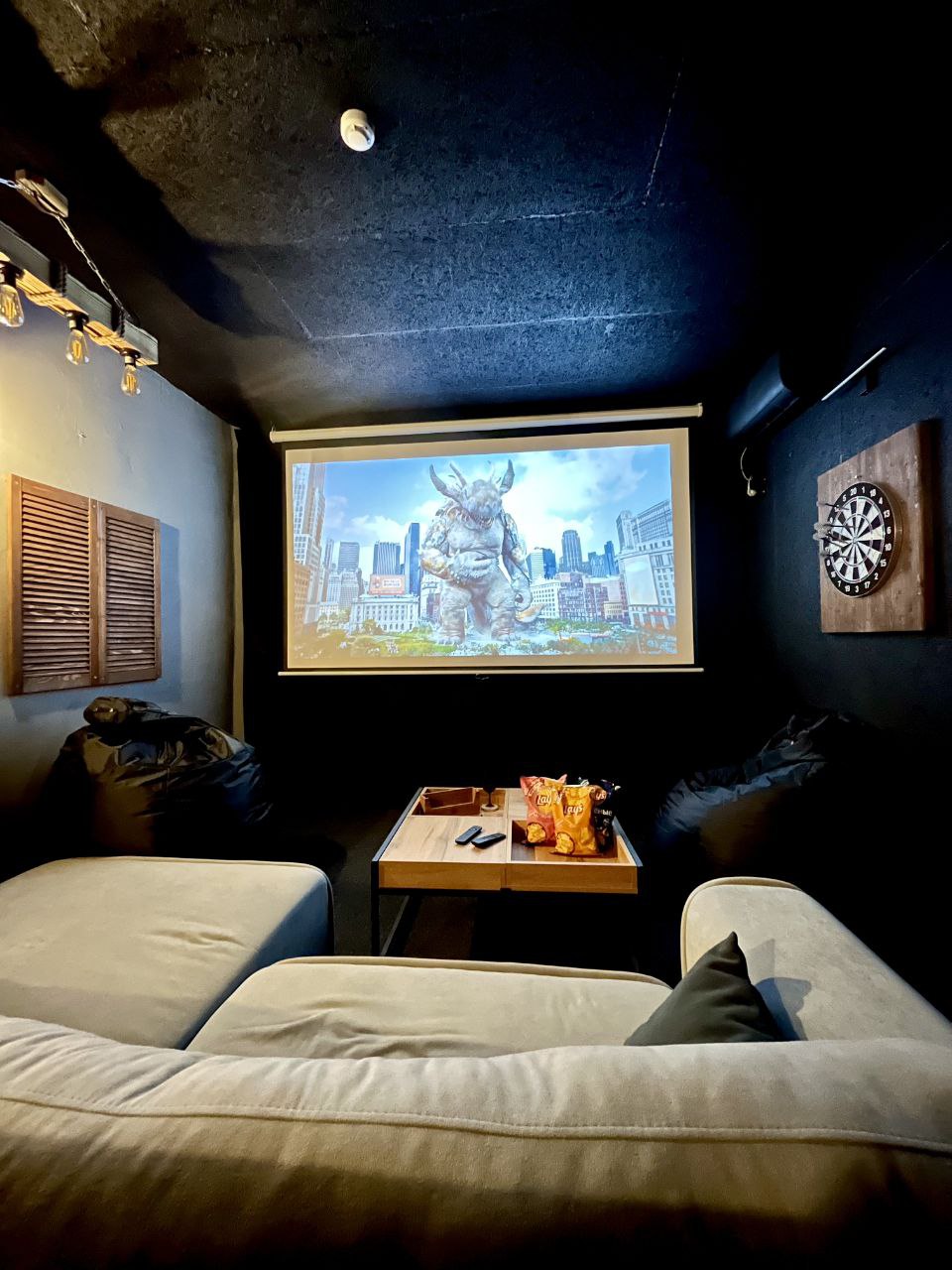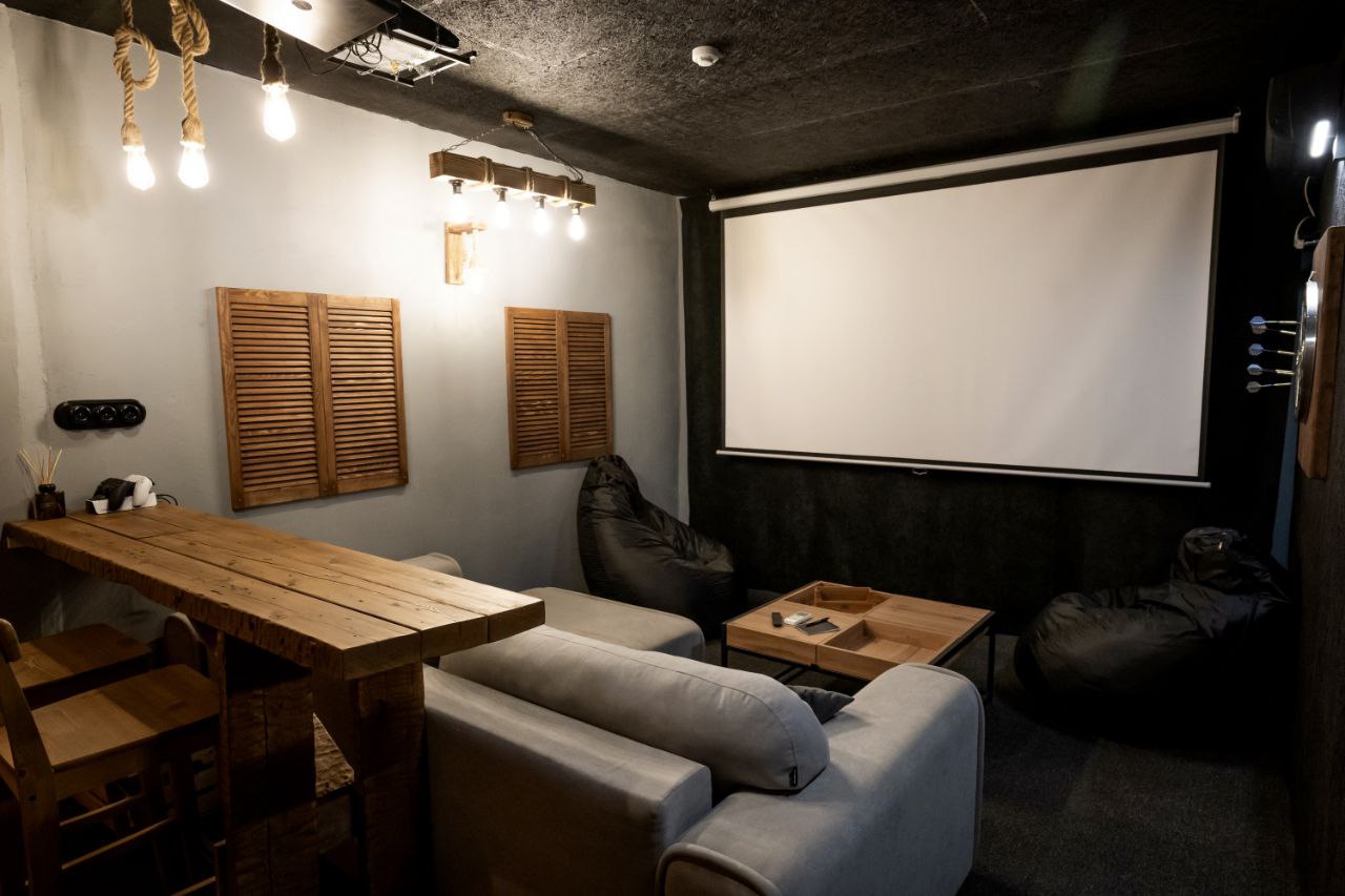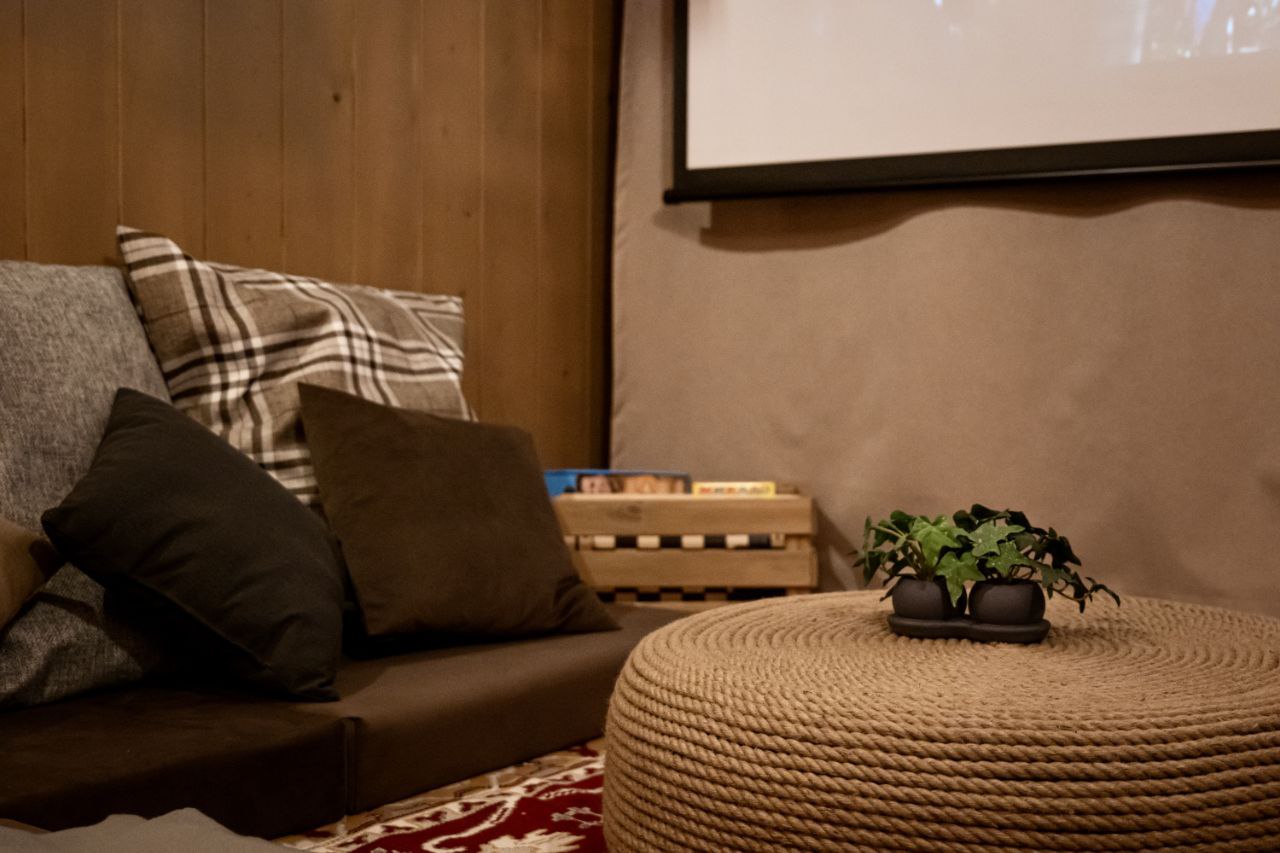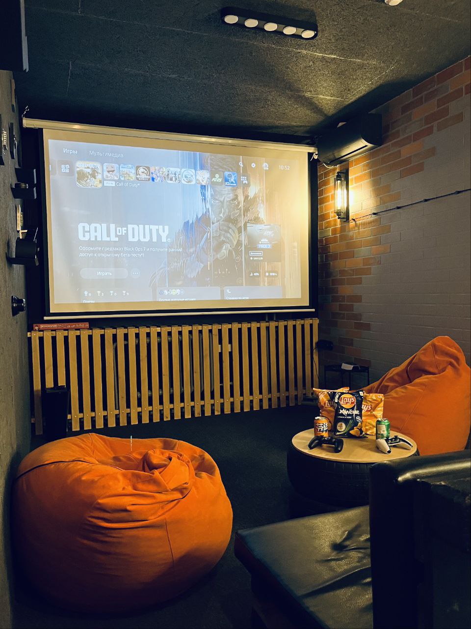 Идеальный вариант для кино-просмотров и просто уютных посиделок в аутентичной обстановке, где можно будет поиграть в настольные игры или PlayStation 5. В комнате расположен диван из эко кожи и 2 больших пуфа.