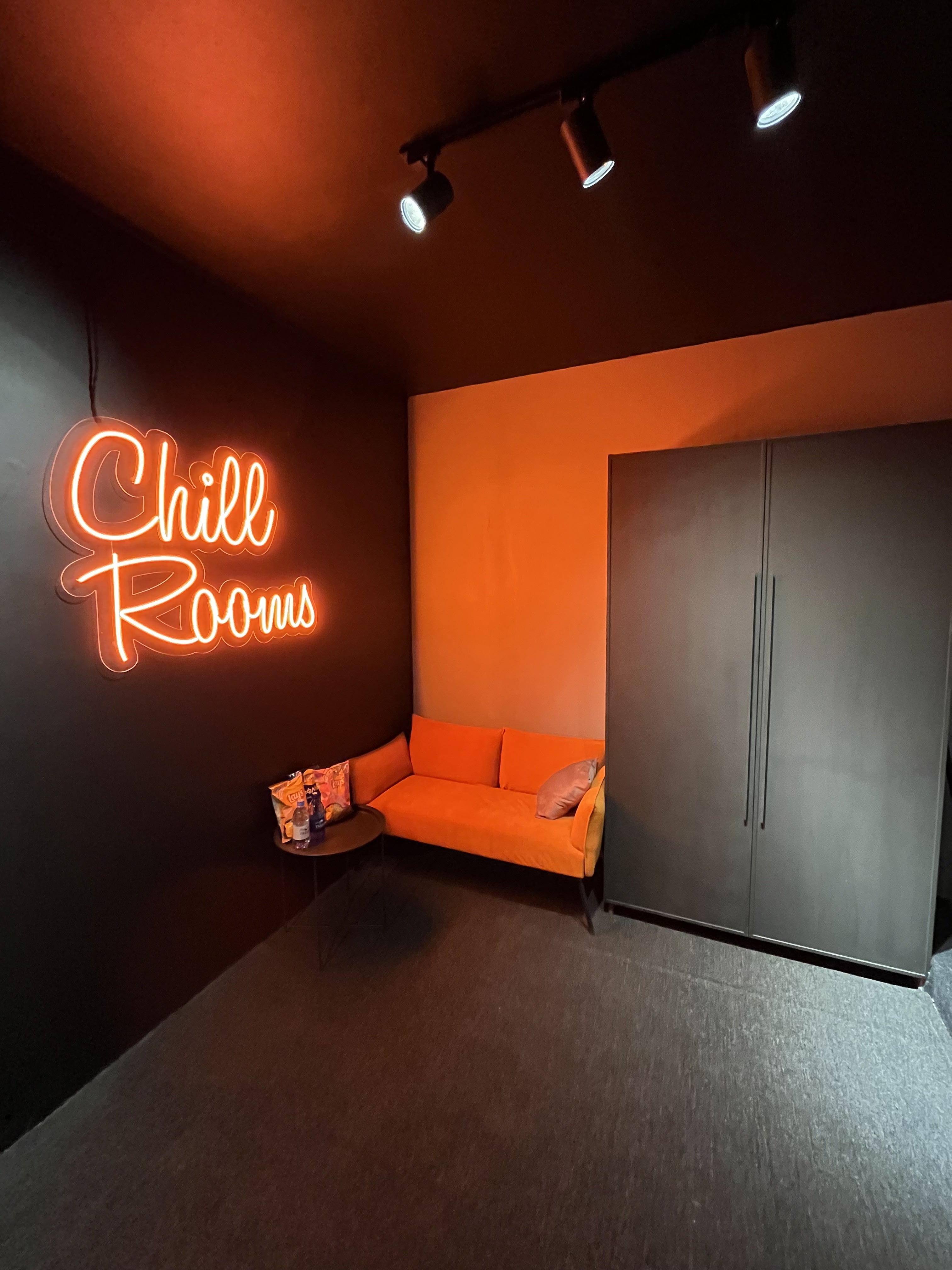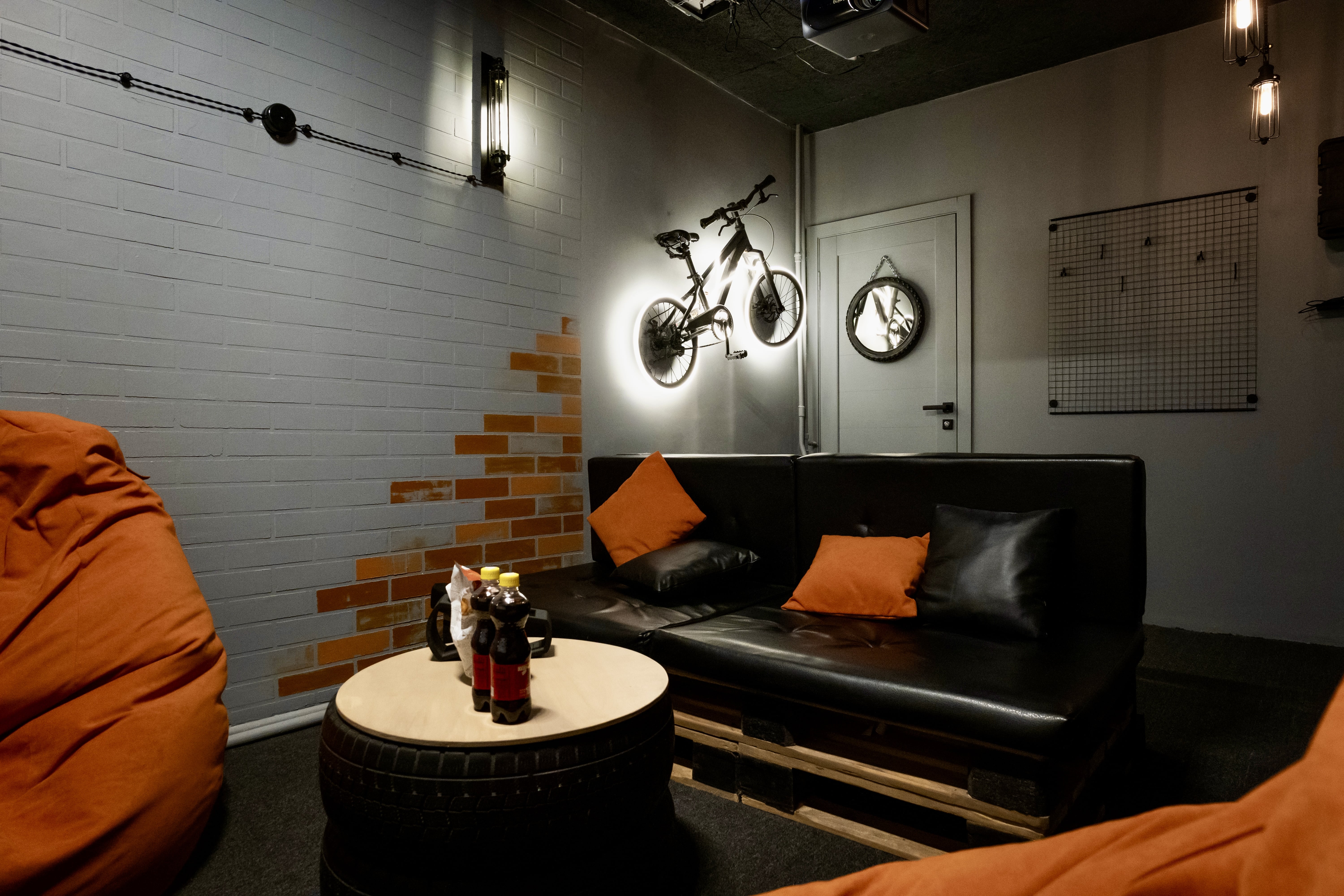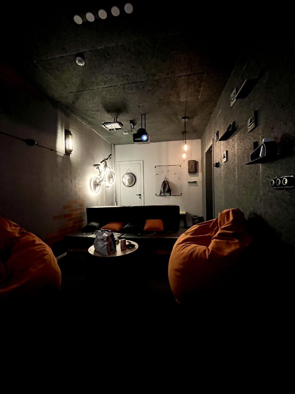 Хороший вариант для свидания в уютной обстановке, дружеских посиделок, вечеров с семьей а также для проведения мини-вечеринок в кругу близких. В этом зале можно поиграть в игры на PS 5, посмотреть кино на самом большом экране, выбрать из наибольшего количества настольных игр свою любмую и даже поиграть в Дартс. Зал отлично пододойдет для записи видео контента, подкастов и прочих съемок. В нём расположились: большой уютный велюровый диван, 2 пуфа, деревянная барная стойка ручной работы, а подсветка барной стены создаёт атмосферу реального Бара.