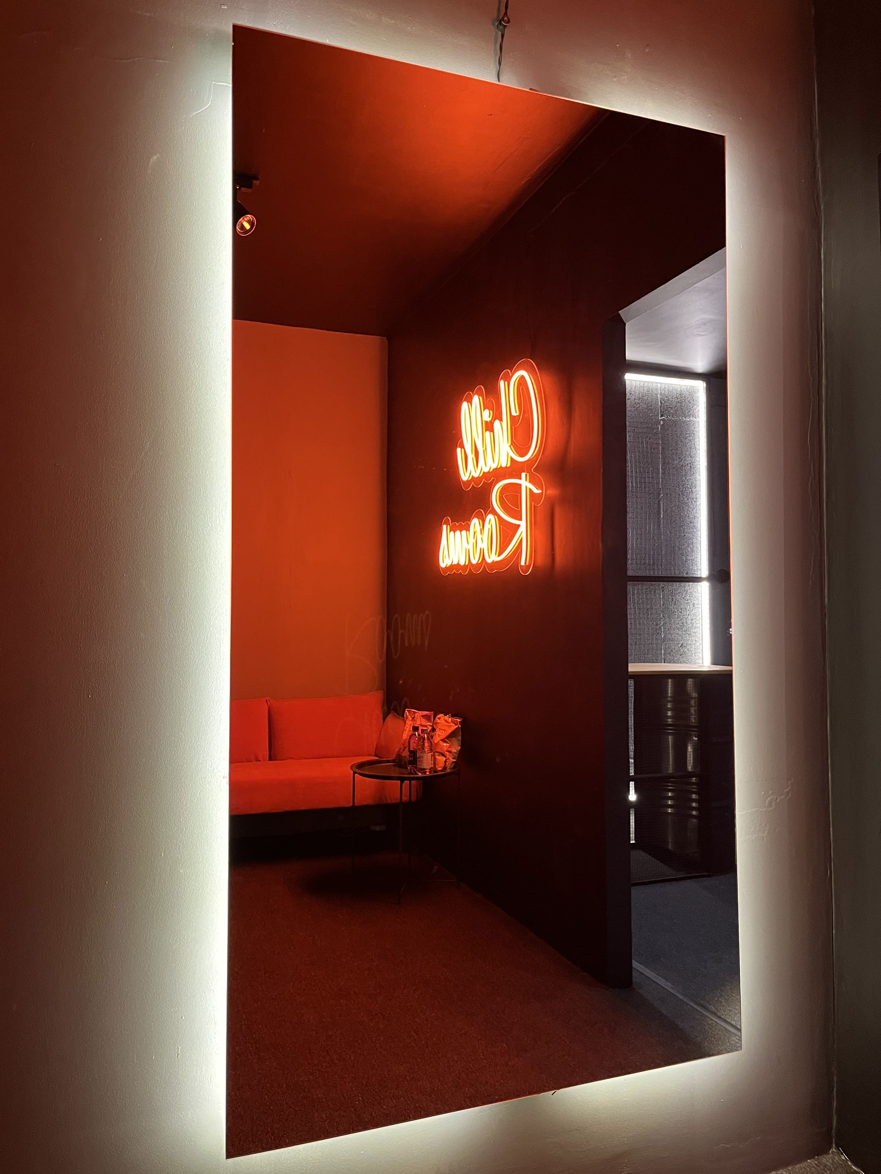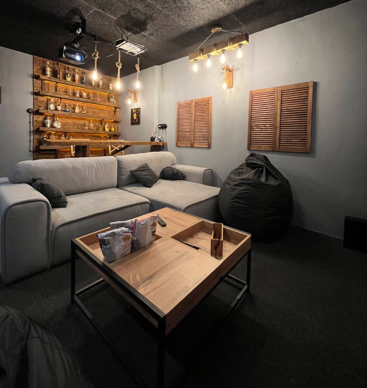 Хороший вариант для свидания в уютной обстановке, дружеских посиделок, вечеров с семьей а также для проведения мини-вечеринок в кругу близких. В этом зале можно поиграть в игры на PS 5, посмотреть кино на самом большом экране, выбрать из наибольшего количества настольных игр свою любмую и даже поиграть в Дартс. Зал отлично пододойдет для записи видео контента, подкастов и прочих съемок. В нём расположились: большой уютный велюровый диван, 2 пуфа, деревянная барная стойка ручной работы, а подсветка барной стены создаёт атмосферу реального Бара.