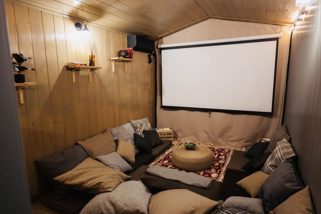Идеальное пространство для свидания и романтического вечера. Если хотите уютно лежать в обнимку, в пледике, на мягких подушках под свечение гирлянд - Вам сюда. Комфорт, тишина и ваш фильм на большом экране.