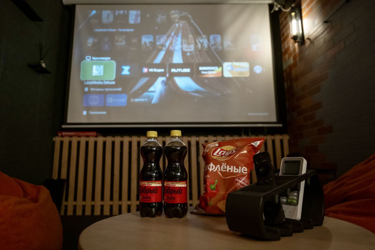 У нас профессиональные проекторы, качественный звук и большой экран. Простое интуитивно понятное управление. Zona, VK Video, Rutub, Кнопоиск, LazyMediaDeuxe -Вы сможете найти любой фильм.